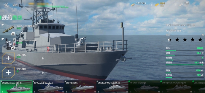 飓风号(旋风级)是一款速度极快、机动性极佳的巡逻艇,装备了两座自卫炮和六枚AGM-176格里芬导弹。虽然导弹的单发伤害较低,但数量优势明显,可以连续发射六枚导弹,对敌方目标造成持续的压制。此外,其高机动性和速度使其在躲避敌方攻击和快速补给物资方面表现优异,然而,飓风号的缺点也不容忽视,缺乏有效的防空设备,且耐久值较低,容易被敌方击毁。
