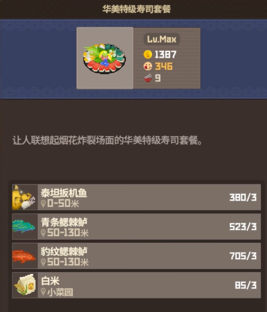 首先要说的是开局就非常值得尝试的“华美特级寿司套餐”。这道寿司不仅看起来高端大气上档次,制作也很朴实无华。需要的食材包括泰坦扳机鱼、青条鳃棘鲈、豹纹鳃棘鲈各3份,再加上白米3份,就能烹制出这道既实惠又高效的美味。满级后售价大约为1387金币一份,一次制作可以达到9份,是新手玩家最稳妥的选择之一。而且解锁条件也不复杂,只需要完成导演任务,就可以轻松获得这道菜谱。