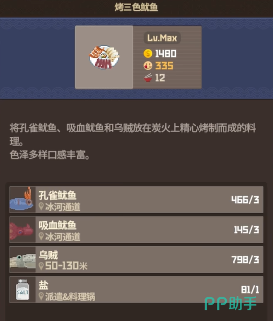 到了中期,你一定会爱上“烤三色鱿鱼”。这是一道简单粗暴又高产的赚钱神器,特别适合餐厅高峰时段使用。需要的食材包括乌贼、孔雀鱿鱼、吸血鱿鱼各3份,再加上一点盐。这道菜满级后单份售价为1480金币,一次能制作12份。特别是在餐厅客流量较大的情况下,它几乎可以应对所有需求。15级以上的玩家一定要安排上这道菜,尤其是36人夜市和45人高峰时段,表现非常出色。