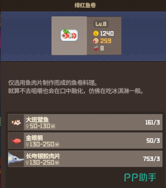 接下来不得不提性价比之王——“绯红鱼卷”。它是一道从中期用到后期都很实用的经典料理,适合追求高效率的玩家。制作所需的食材包括长吻银鲛肉片、金眼鲷鱼和大斑躄鱼各3份。这道菜满级后的售价高达1480金币一份,并且一次能制作9份。更棒的是,员工“比利”升到15级后就可以解锁这道料理。对于想快速提升收入的玩家来说,这绝对是一道不能错过的菜品。别小看这些普通鱼类,早期多储备一点,到后期你会感激自己的远见。