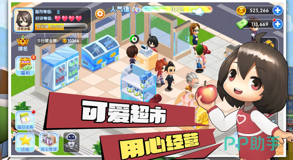 在这款手游里大家将体验从一个穷光蛋到亿万富翁的巨大飞跃。大家将从一个门槛最低的杂货商店做起,一步步培养自己的客源,发展自己的人脉随后一个店变成两个店,一种店变成多种店比如水果店、零食店、甚至美容院。游戏为大家提供了一个非常庞大的商业系统,大家可以任意选择,但是最初要从小商店做起哦!