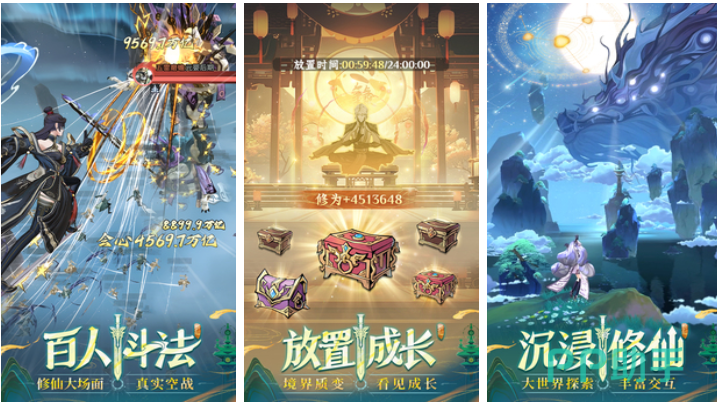 喜欢看玄幻小说的小伙伴看到问剑长生的游戏内容肯定会眼前一亮,本作不仅有写实的玄幻世界背景甚至加入了百人斗法的大场面,震撼的特效展现跟玄幻世界观的塑造足以使玩家叹为观止,自由放置挂机让角色自动成长的设定沉浸感十足,逼真的修真流程+修真小说般紧凑的剧情脉络也是亮点。