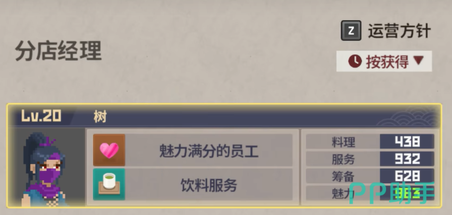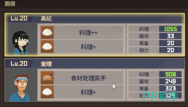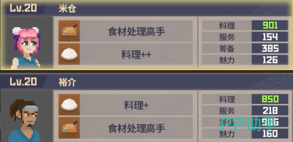 除了这些固定的成长机制,每个员工的属性——料理、服务、筹备和魅力,也会影响他们在不同岗位上的表现。根据这些属性的高低,员工可以大致分为三类:后厨员工、大堂员工和经理。料理直接影响员工的出餐速度,料理数值越高,菜品出得越快,这对于餐厅的运营来说至关重要。服务决定了员工送菜的速度。如果大堂员工的服务数值高,那么顾客等待菜品的时间就会大大缩短,提升顾客满意度。筹备指派员工去进行资源收集时,筹备数值越高,员工带回的物品就会更多,例如有些员工可以带回更多的食材、材料,这对于长期的餐厅运营至关重要。魅力影响员工派遣时获得的物品数量,魅力高的员工,派遣后能带回更多的资源,甚至可能影响顾客的耐心度,减少差评。