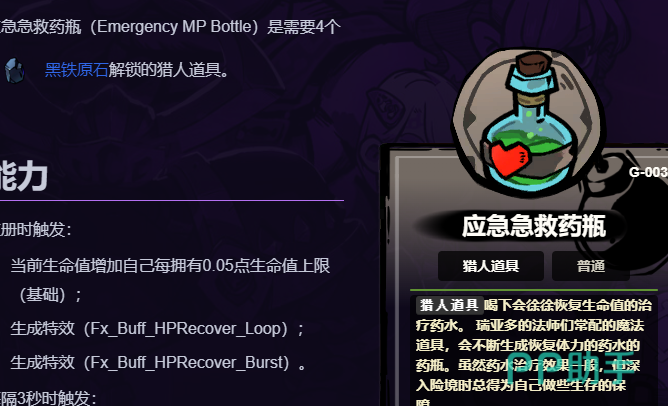 使用这个道具会缓慢的回复生命值,比较适合游戏中的法师去进行使用,每次使用都可以增加0.5的生命值上限,会持续15秒,大几爱可以使用四个黑铁原石去进行合成的。