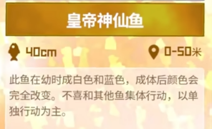 皇帝神仙鱼喜欢在水深0到50米之间的区域独自巡游。幼鱼时期,它们拥有白色与蓝色交织的外观,而成年后会展现截然不同的艳丽色彩。这种变化让它们成为许多玩家心目中的收藏目标。但要注意,皇帝神仙鱼一向独行侠,不会和其他鱼类群游,想找到它得擦亮双眼。