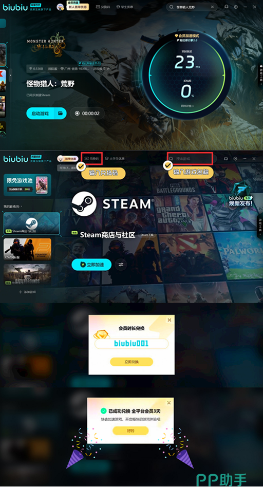 老用户们也不用担心,小编今天给大家带来了一个免费的兑换码【biubiu001】,这个兑换码是新老用户都可以使用的,大家只需要在界面中的右上角兑换码选项里直接使用即可,里面包含着长达72个小时的免费游戏时长。也就是说小伙伴们最多可以获得的免费游戏时间一共是75个小时哦。