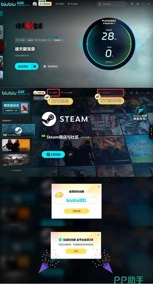 玩家在游戏中如果想要体验更多的趣味性,想要避免游戏的卡顿,还可以选择一个加速器。现在加速器还可以领取免费加速时长,新用户在注册之后可以免费3小时。使用兑换码【biubiu001】还可以在原本的基础上又免费72小时,把这两者搭配在一起就可以免费长达75小时。