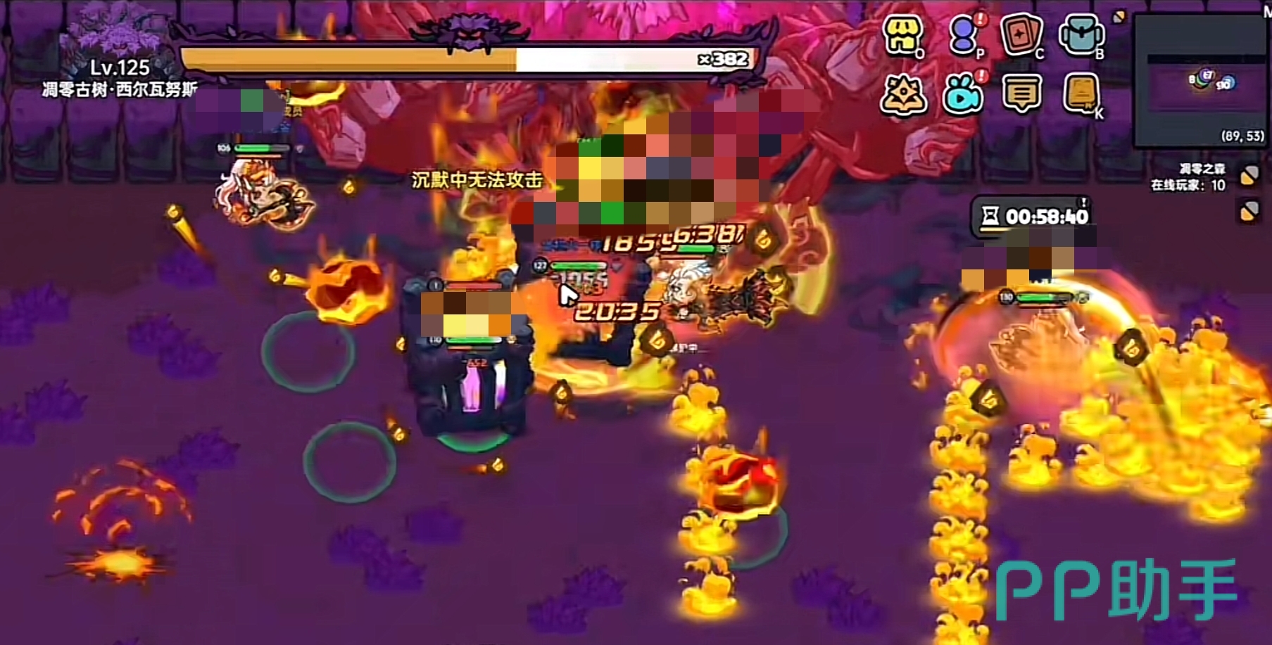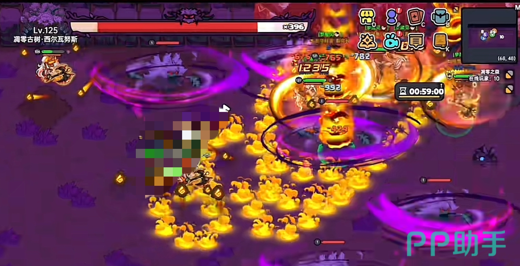 需要注意就是地上如果有这种紫色地雷的话,走进爆炸范围它就会触发并且延时爆炸,伤害特别高。所以可以选择主动提前出发然后规避防止后面出现走位失误。队友头上出现树叶标识的时候,千万不要放技能,否则boss会回复很多血量,一瞬间可能就会回复100多管血量,只要注意这个基本上十个人疯狂的输出一会就可以将其击败了。