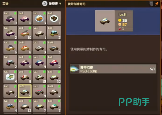 捕捉到带拟鲹之后可以带回餐馆,制作真纪想吃的食物黄带拟鲹茶泡饭,这个食物除了需要三条黄带拟鲹鱼之外还要一张昆布以及一份酱油,这样才能够将此食物制作完成。昆布与海里的海带比较相似,海洋中大量存在,每当遇到直接割下来就可使用。酱油可通过开箱子或者派遣用户的方式获得。