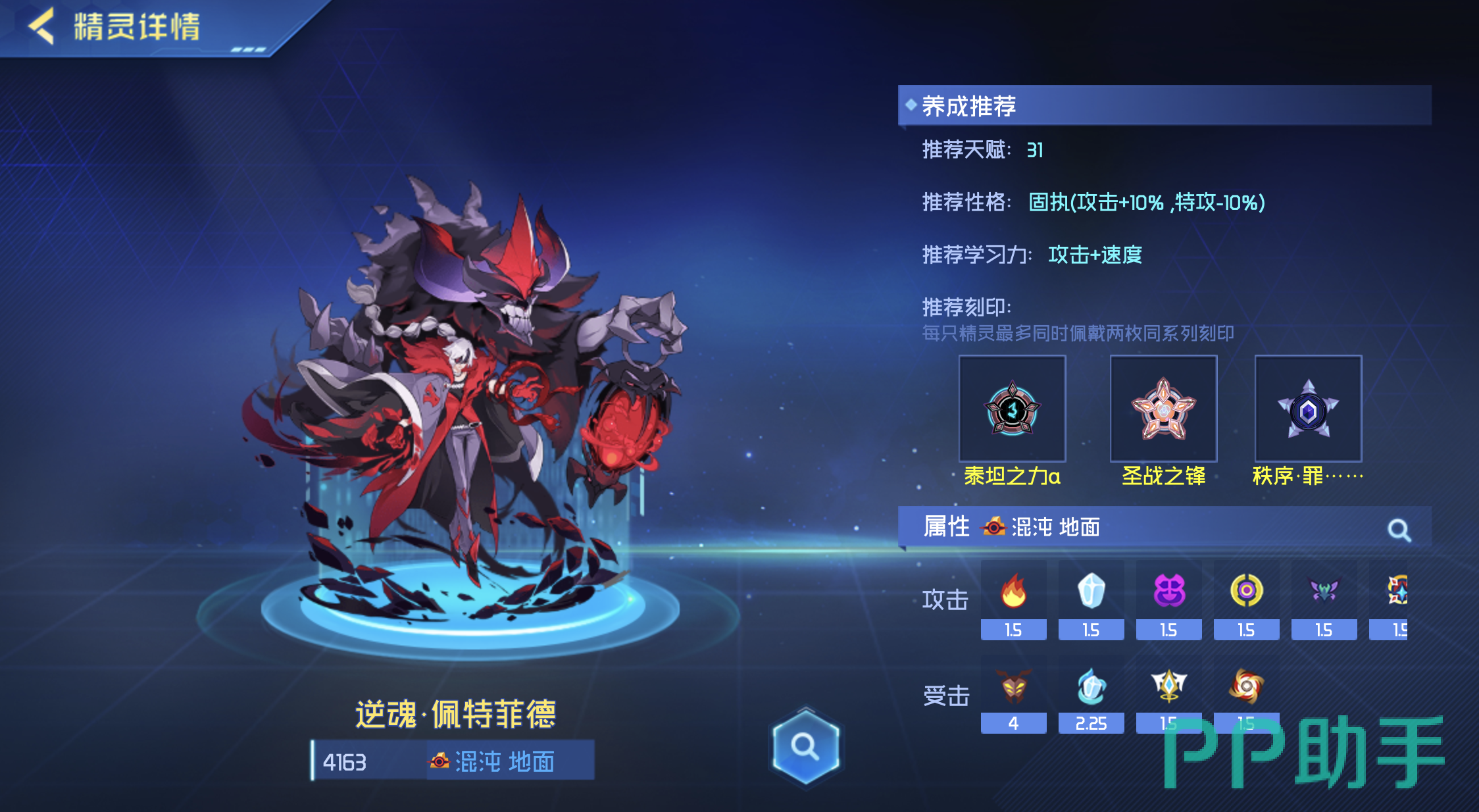 在养成方面,逆魂佩特菲德推荐选择天赋31,这样能提升其整体战力。性格方面,固执是最佳选择,可以提升攻击力10%,尽管特攻下降10%,但攻击力的提升更符合逆魂佩特菲德的战斗需求。学习力上,建议优先提升攻击和速度,以增强其输出能力和战斗节奏。