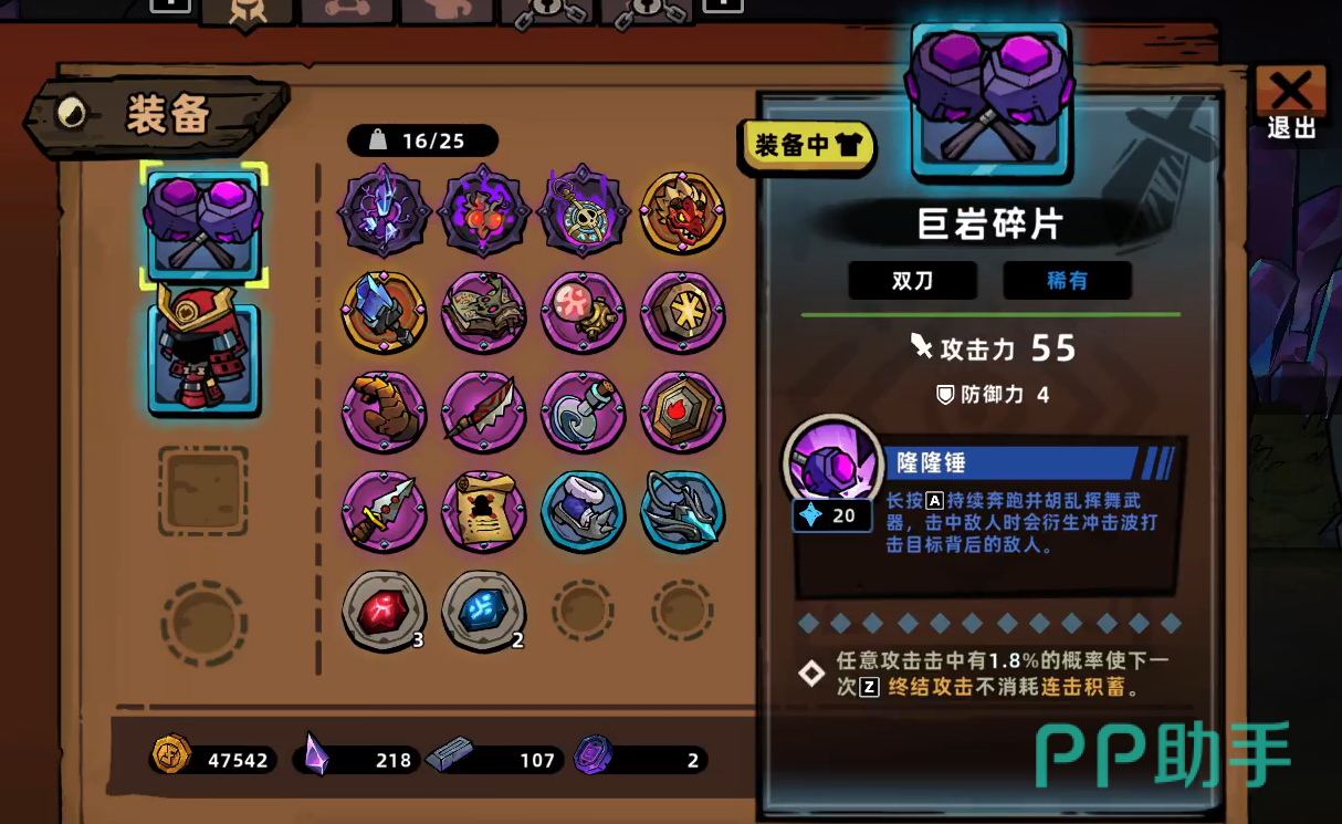在游戏中锤子属于双手武器,玩家在游戏的boss关卡以及商店中都能够获得这件武器,其中最常见的就是巨岩碎片,当玩家持有这个武器的时候奔跑攻击将会变成范围性伤害,能够帮助玩家更好的清理地图中的小兵。