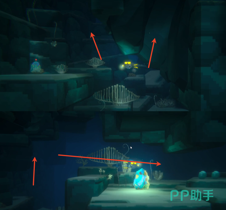然后继续往左游,一直往左游,游到底,就是游到最左侧的方向。游到最左侧之后,会发现有2个通道,这2个通道其实都是能上去的,这里以左边的路为例,这边更为宽阔的道路上有不少水母,而右边则是有管虫。