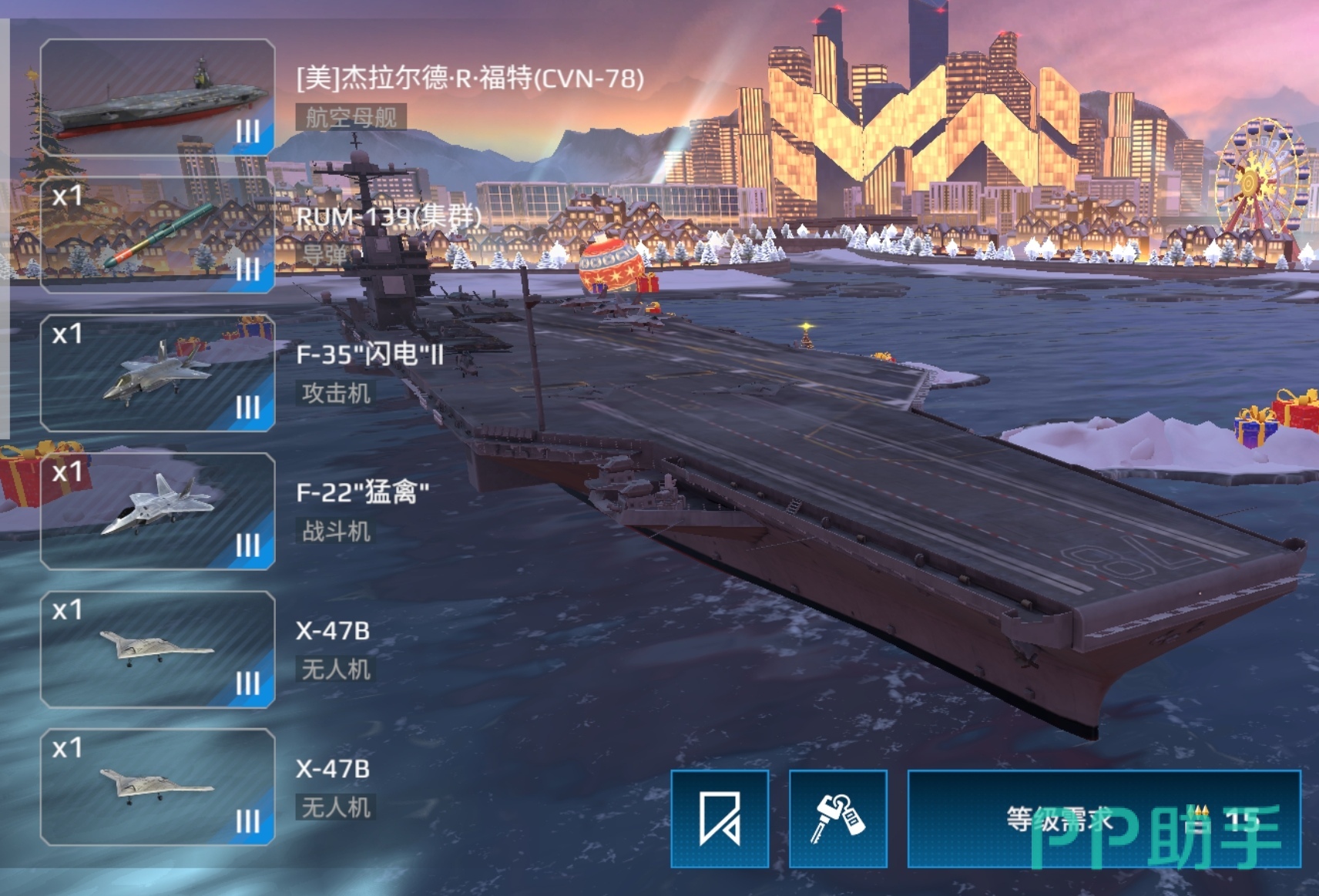 福特级航母综合作战能力很强,上面还能搭载f35、f22等战机,进一步提升了它的远距离打击能力,此外,航母上搭载的防空武器,能有效护卫航母本身,在实战当中,玩家可以将母舰放在远处,操控上面的战机完成攻击,这样可以避免被对手发现,等到你的账号到达了15级,就能在军火商店内购买它了。