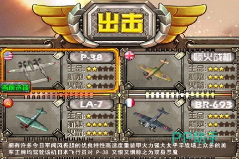 这是一款闯关的飞行游戏游戏,游戏中有多个关卡在等待玩家体验,玩家所知道二战时期经典的空战在游戏中都可以找到,玩家可以驾驶哪个时代的经典飞机开始游戏,游戏中有二战时期著名的飞机介绍,也有二战时期空战的讲解,空战有飞机攻击玩家,地面有防空火力攻击,玩家要一关一关的挑战,每关都有一个不好对付的在等待着玩家,玩家要想着如何解决这个麻烦。