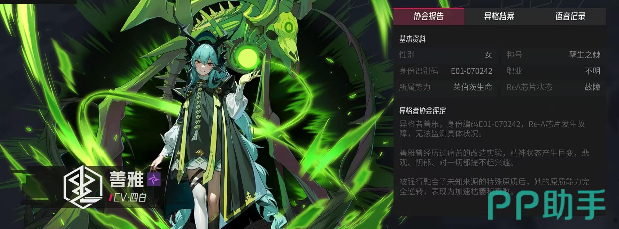 根据目前伊瑟重启日中所公布出来的这些角色外形,大家不难发现,其实绿头发角色指的就是善雅。善雅是属于恒定源质属性的sr稀有度人物,属于超链者协会,称号是净善之女。善雅曾经是一所孤儿院的孤儿,后来和人类形成了收养关系,她性格孤独但能量波动稳定温和,循环不息,如同本人一样温柔和煦,可以抚平伤痛,展现出了强大的治愈能力,这些能力也体现在了她的技能中。
