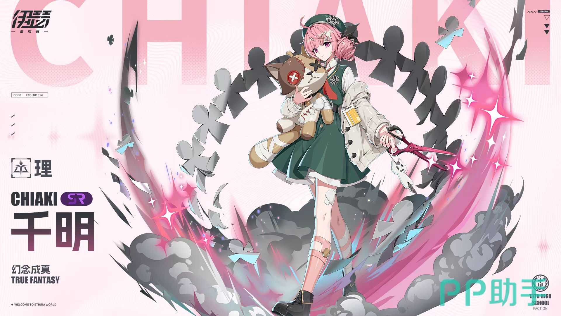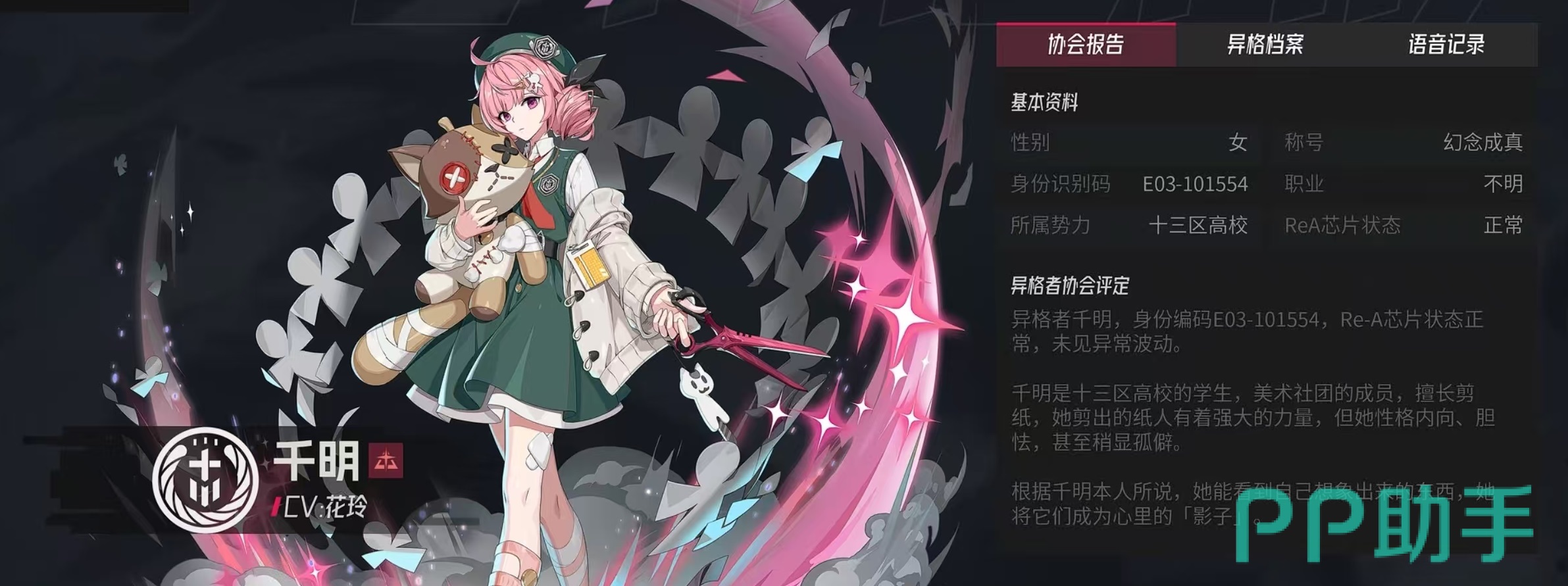 在游戏的背景故事中,千明是十三区高校的学生,也是美术社团成员,她非常擅长剪纸,剪出的纸人拥有强大的力量,这些特点也体现在了她的技能中。普攻飞燕,千明制作出纸人,飞向并攻击敌人,对单体敌方目标造成200%伤害,同时还会对生命百分比最低的队友进行一次治疗,按照目标生命值上限的10%来恢复血量。既有伤害又能治疗的普攻,所以说非常全能。