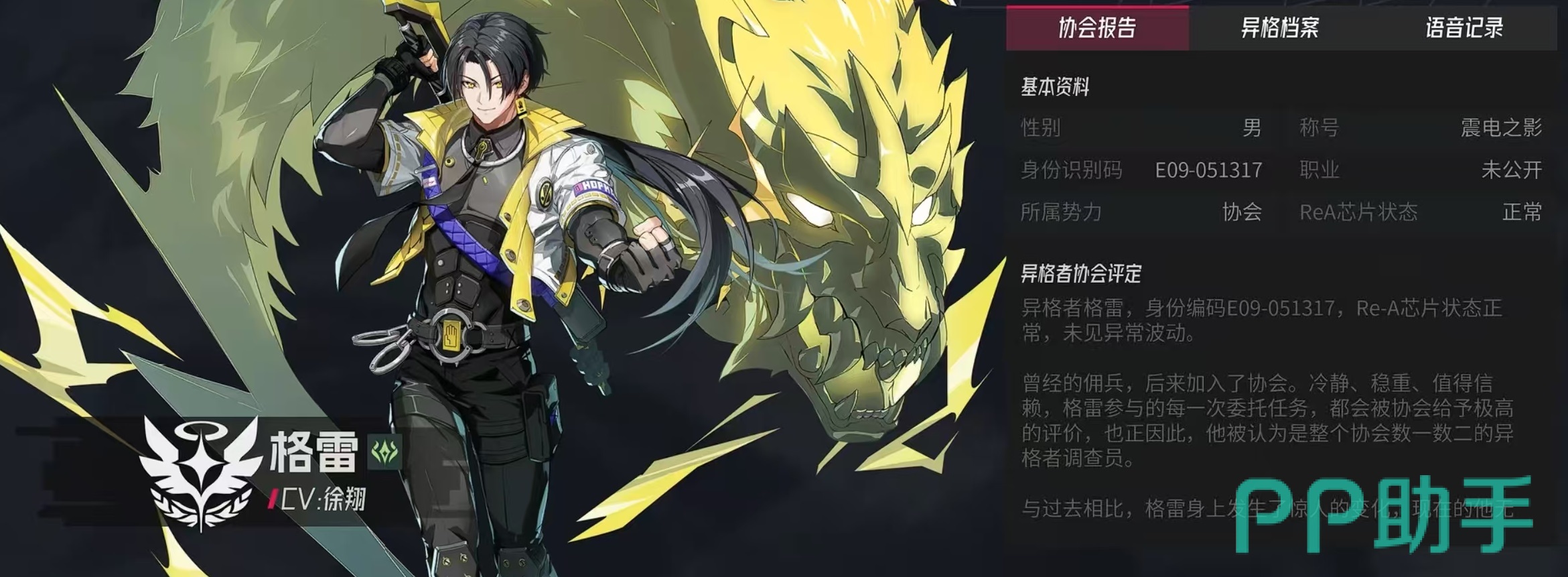 惊霆和格雷这两个角色在外形以及属性方面都非常接近。更改之前的惊霆是属于一名警察,他致恶如仇,风驰电掣,擅长用雷击来攻击目标,所属的势力伊瑟E.O.S,原质能力为雷殛天罚。而更新之后的格雷是属于超链者协会,自身称号为震雷之影,也继承了雷属性的特点。他在背景故事中是一个稳重、冷静,值得信赖的雇佣兵。普攻电擎,向武器中注入雷电的力量,迅速突袭目标对单体敌人造成210%伤害,如果出现暴击还能提高自身10%行动进度。