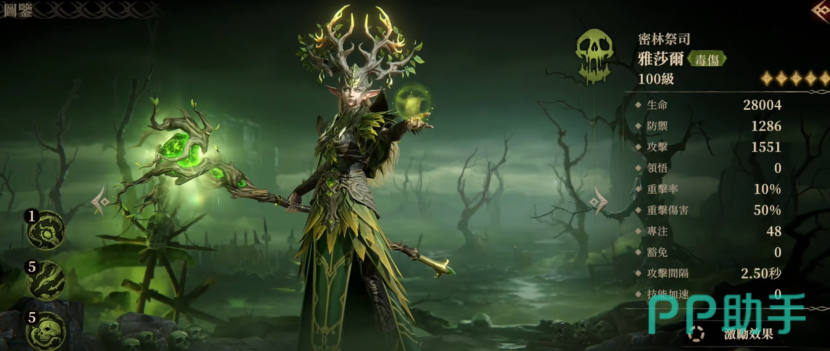 然后还有可以造成毒属性伤害的雅莎尔,他则更偏向于法术输出类型。大招的话可以直接对范围敌人造成毒素伤害,如果毒伤状态层数很高的话,那最终造成的百分比伤害更高,不过会移除毒素效果。然后还能阻止敌人复活,用来打小怪的话再好不过了。不过想要让伤害起来的话也要多准备一些加毒素的英雄。