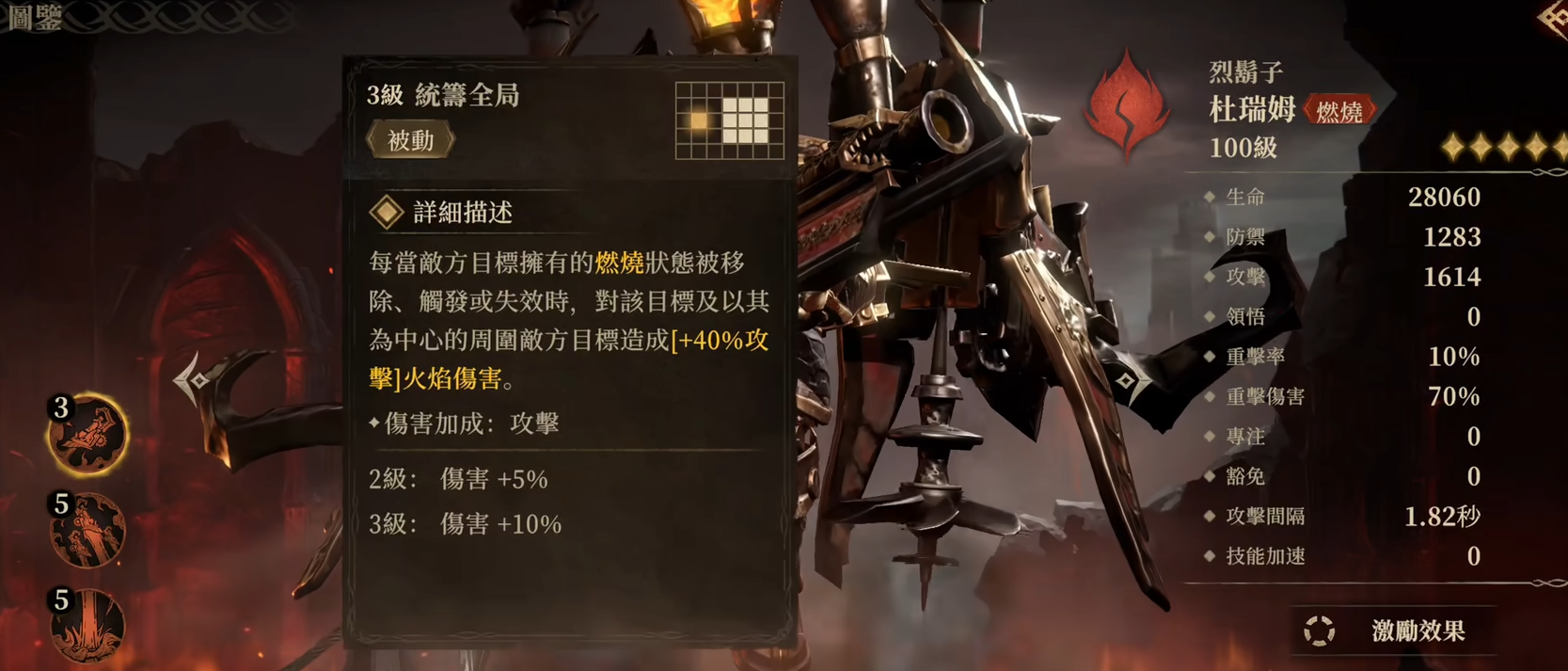 接着还有杜瑞姆,同样属于燃烧属性的角色。它可以随机锁定三个目标,并造成火属性导弹伤害。并有一定的概率增加灼烧状态,所以搭配前面的火属性队友的话,伤害也会更高。大招的话可以随机轰炸前方目标区域,并造成高额伤害。然后还可以削弱对方的防御力,非常给力。自身的防御力以及生命值也高,所以可以放在中间或者前排。