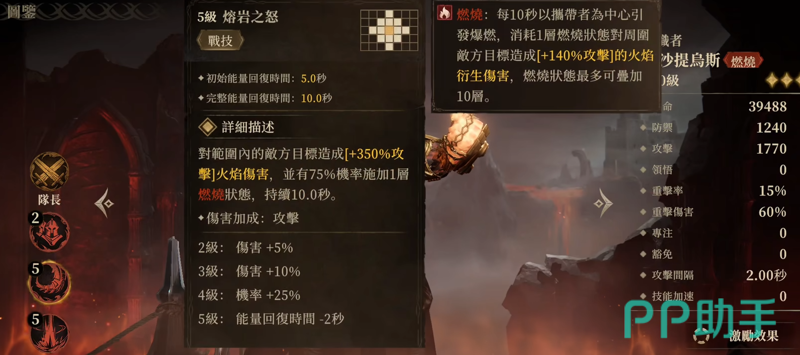 然后还有同样属于燃烧属性的提乌斯,他充当的是队长。是一个主打防御和进攻的坦克型角色,当他在场的时候就可以提升所有队友30%的攻击力。攻击可以造成火焰伤害,如果处于灼烧状态的话伤害会更高。大招的话给造成爆发伤害,不过会移除所有敌人燃烧效果,适合用来收尾。