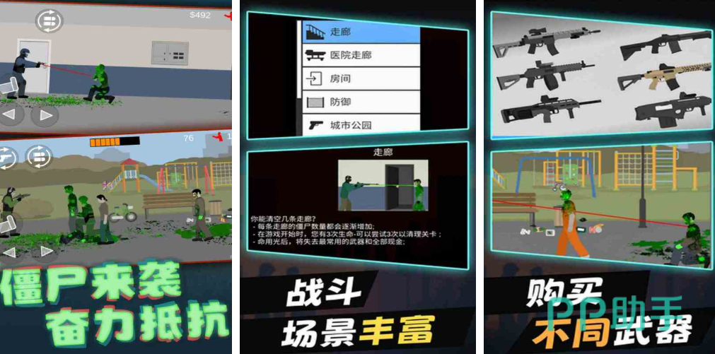 退这款僵尸主题的射击手游里,玩家可以体验到非常自己有趣的横版射击僵尸玩法!游戏有很多场景可以前往探索,比如说医院的走廊或者是公园等地方,而且能选用的武器也有非常多种,冲锋枪,霰弹枪等等,用这些武器来射僵尸特别有意思!在不同的场景里,出现的僵尸也会有所不同哦!