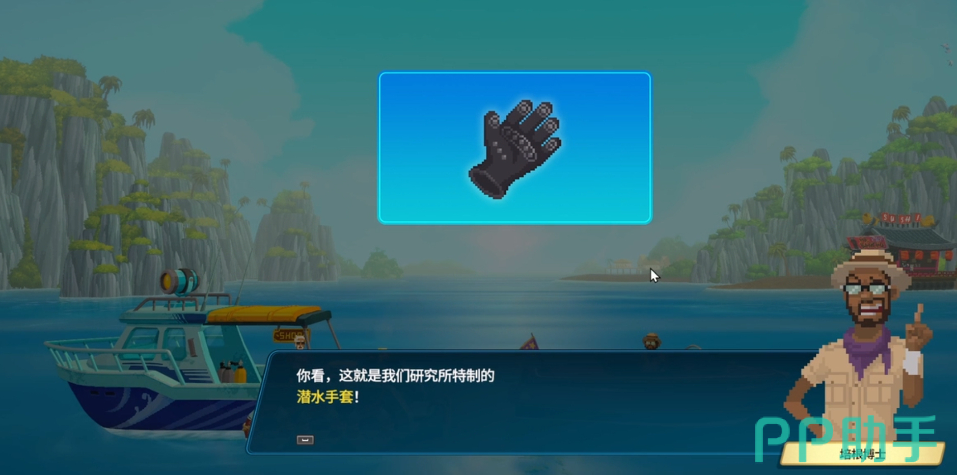 这双手套就是我们获得的第一双手套,它的作用就是可以让玩家在潜水的时候更好去进行扑鱼的行动。同时也可以避免玩家受到海胆等海洋动物的伤害,而且还可以抓住水下的各种物体,对于咱们的潜水员戴夫来说是必备的一件潜水道具!