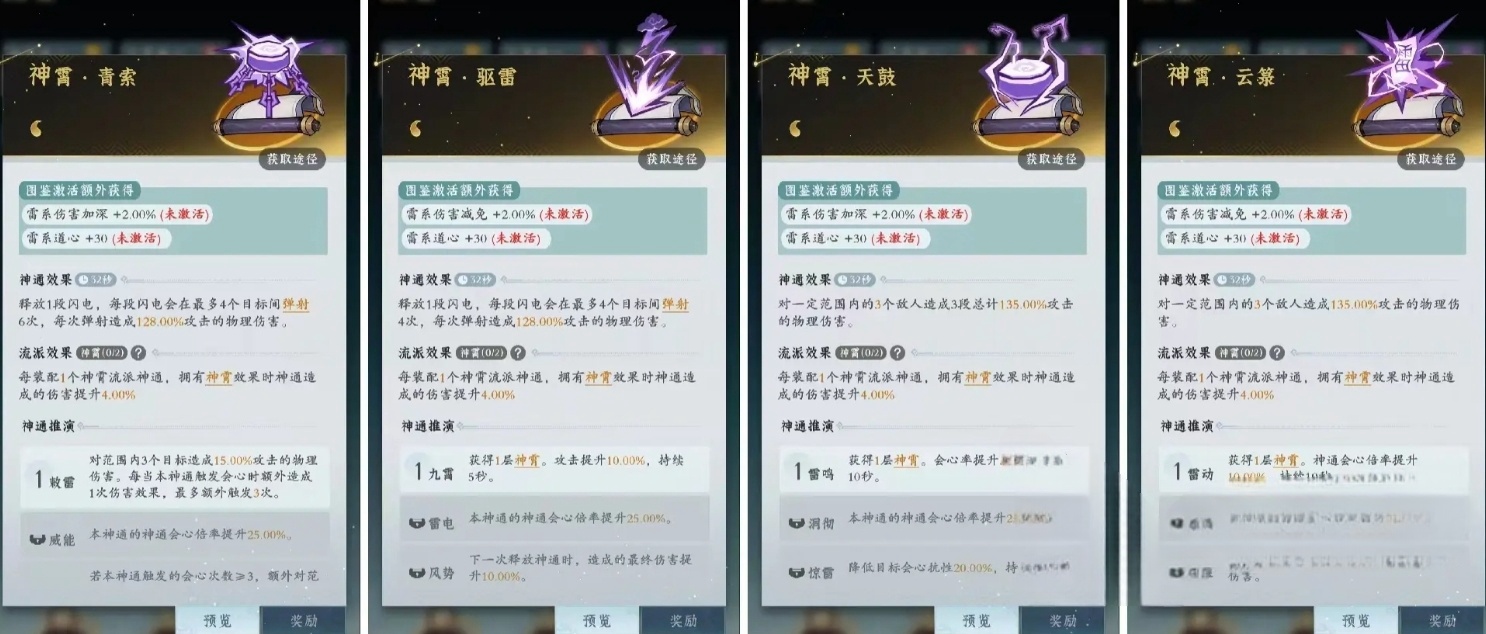 而“五雷·惊蛰”则通过提高技能触发几率与暴击率,确保整体输出的稳定性,让这套组合在副本与群体战斗中表现得游刃有余。相比之下,注重单体输出的神霄流派则更适合PVP或BOSS战。这一流派以“神霄·青索”为核心,通过大幅提升会心倍率对敌人造成致命打击,搭配“神霄·驱雷”和“神霄·云箓”,进一步强化暴击率与伤害加成,同时配合“神霄·天鼓”附带的额外物理伤害,使得整套技能在短时间内爆发出惊人的破坏力。无论是竞技场中的快速决胜,还是面对高血量BOSS时的一击制敌,神霄流派都能为玩家带来出色的表现。