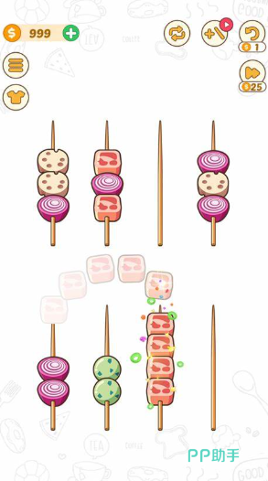 你将面对由烧烤竹签构成的拼图挑战,每一关都要求你将相同的食材巧妙地排列在同一根竹签上,只有同色食物才能自由移动,这无疑增加了游戏的策略性和趣味性。你将遇到越来越复杂的食材组合,从简单的蔬菜到复杂的肉类,每一种食材都有其独特的移动规律。通过不断闯关,你不仅能收集金币解锁更多道具和新型竹签,还能体验到烤串重叠与移动的乐趣。
