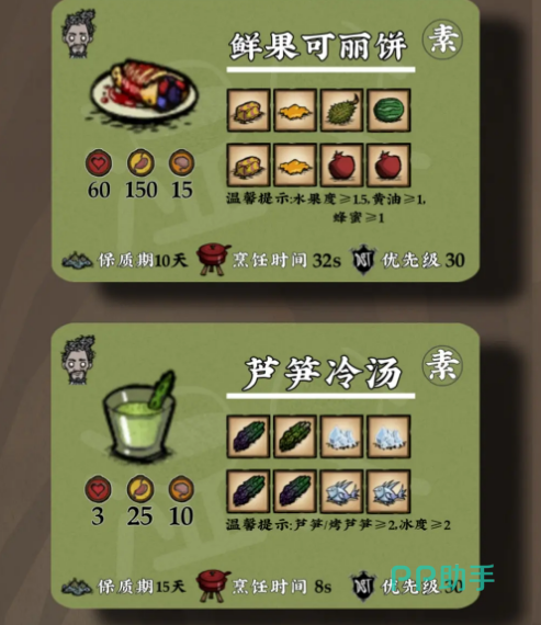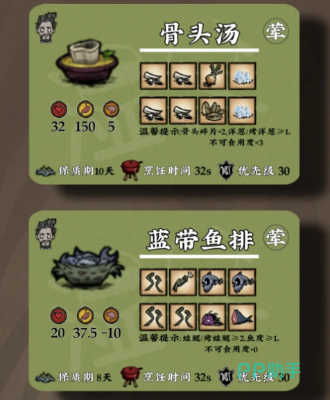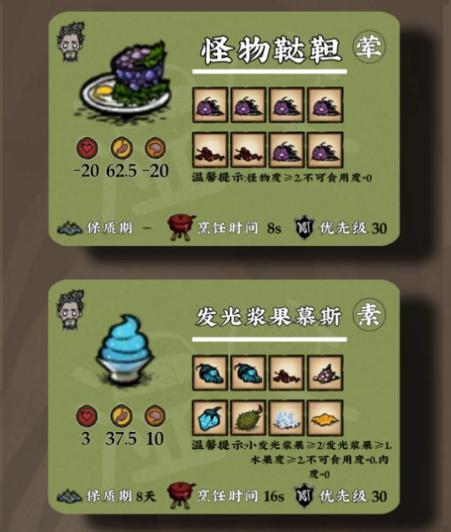 骨头汤能够恢复个人生命值40秒优先度为30.对于肉食爱好者来说非常适合。鲜果可丽饼以及海鲜杂烩这两种特色菜也能够恢复个人的生命值40秒。发光浆果慕斯这是一道甜点,能够散发出非常健康的光彩,非常适合在黑暗的环境下使用。