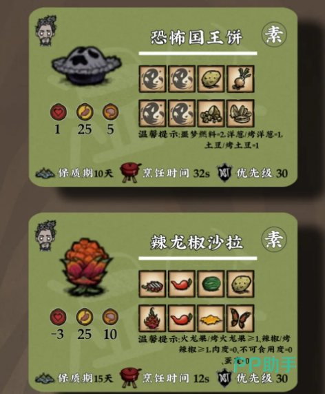 大厨特色菜包含10个,比如芦笋冷汤能够降低体温,在炎热的夏天食用避免中暑。辣龙椒沙拉能够让你的身体变暖与芦笋冷汤形成鲜明对比,非常适合在寒冷的天气使用,需要15天才能喷。蓬松土豆蛋奶酥能够让你的生命值恢复40秒,优先度为30。