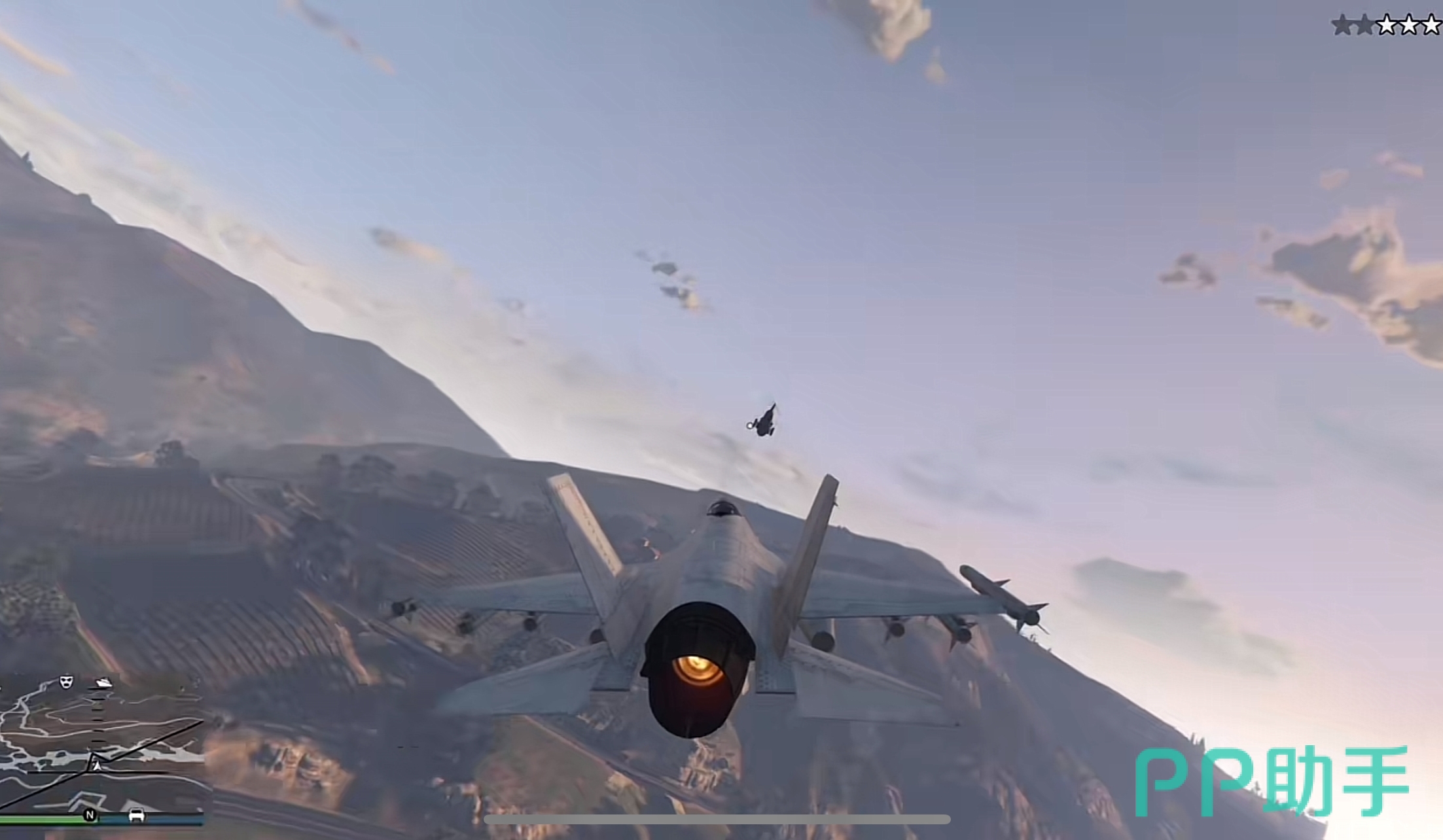 当我们闯入时可能有一定概率会遇到坦克,一定要把偷飞机旁边的坦克利用子弹爆炸代码Highex清理掉,因为不停的轰击虽然有无敌但是会控住我们。而且上飞机之后也一定要打开手机存档,这样在开除军事基地的时候,即使被多枚导弹轰击导致爆炸也能够回档再来一次,首先要低空飞行以免被检测,然后一上一下左右摇摆都可以躲避导弹。