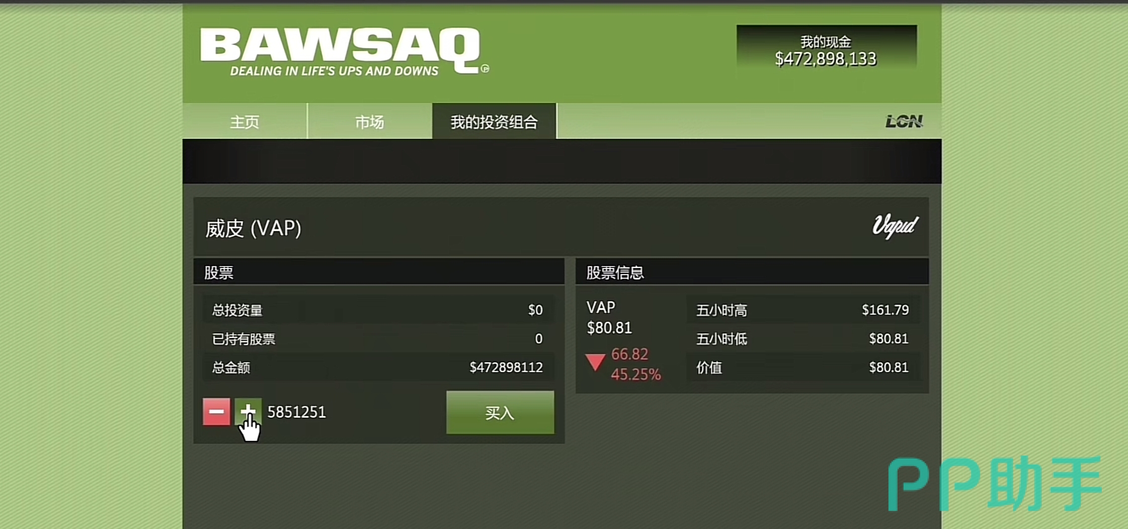所以威皮的股票整体在这个过程中是会呈现先下跌再上涨的趋势,位置在金融与服务第二个绿色网站页面,等股票降到负180或者是两百之后再买,涨幅大约百分之百之后直接卖掉,但是一般最低掉到66%就不会掉到最低了,如果玩家们运气好的话可以多等一会儿。