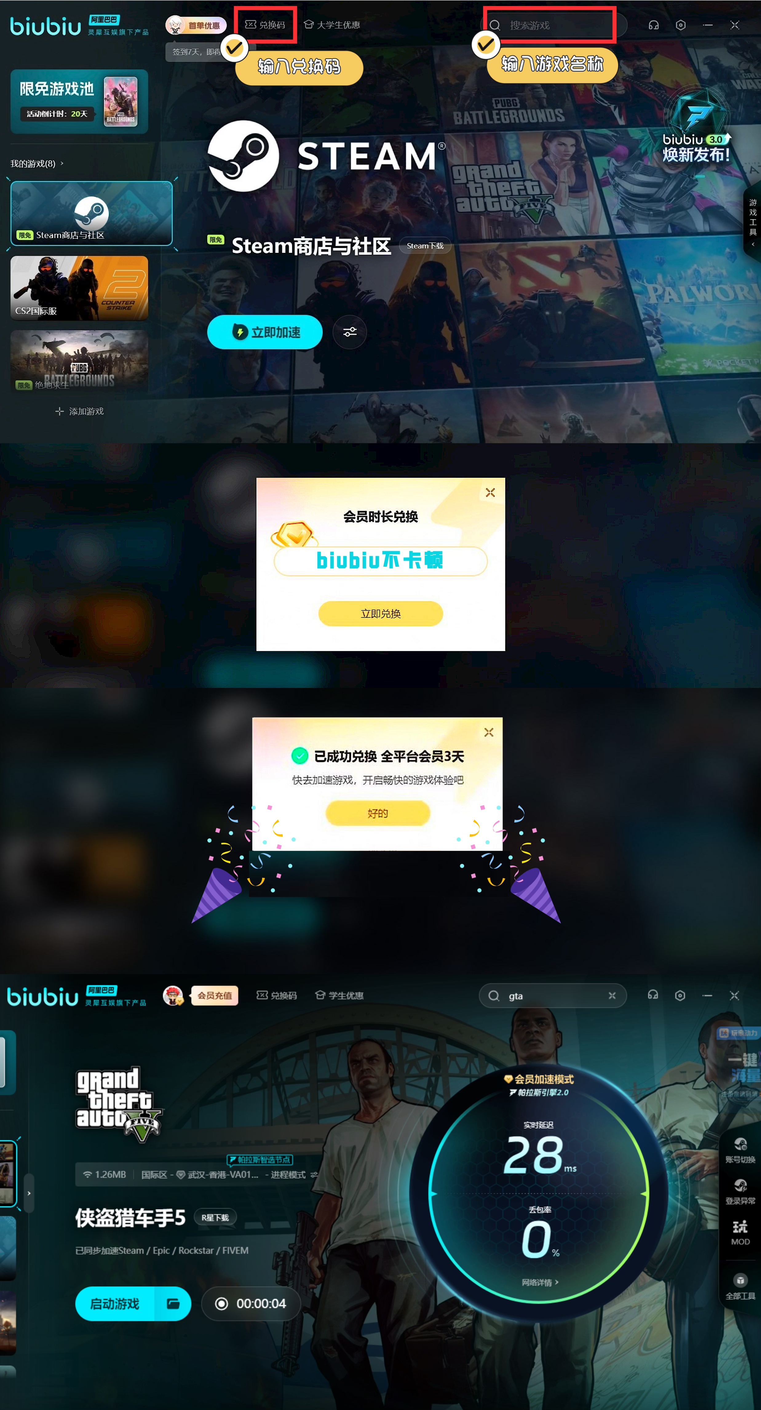 第二个前置任务就是开飞机去抢一辆火车,首先把火车轨道改掉,让火车停下来,首先要撂倒铁路工人,然后爬上哨岗干掉警卫,等待火车插入轨道,然后老崔开飞机用电磁铁将火车头和一节平板拖车带走,因为分红我们需要运用火车头来分黄金。建议在做这个任务的时候开启加速工具,后续只要玩gta5也都可以打开着,避免卡顿导致的延迟耽误任务时机,上面推荐的biubiu现在新人注册免费加速3小时,新老用户输入兑换码【biubiu不卡顿】都可兑换3天免费加速。