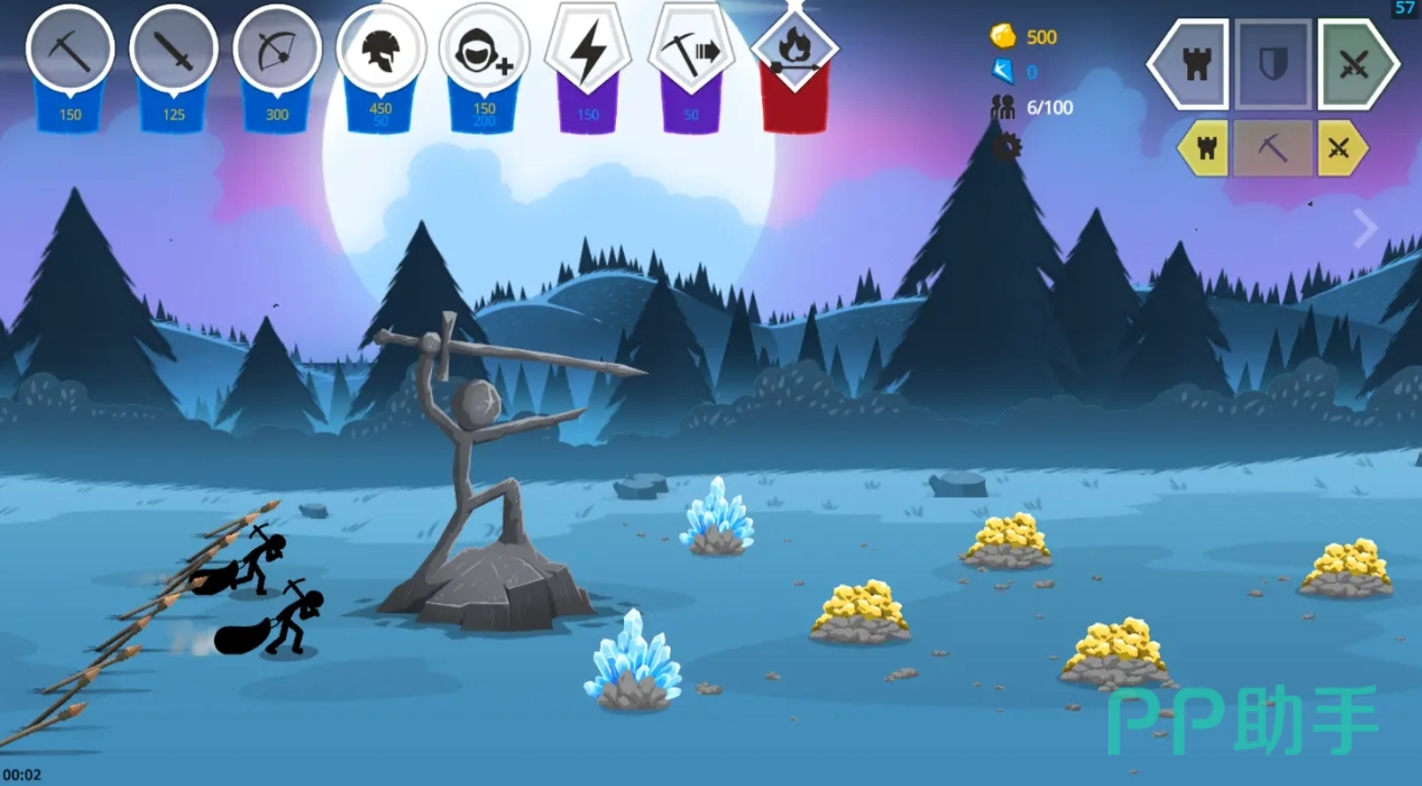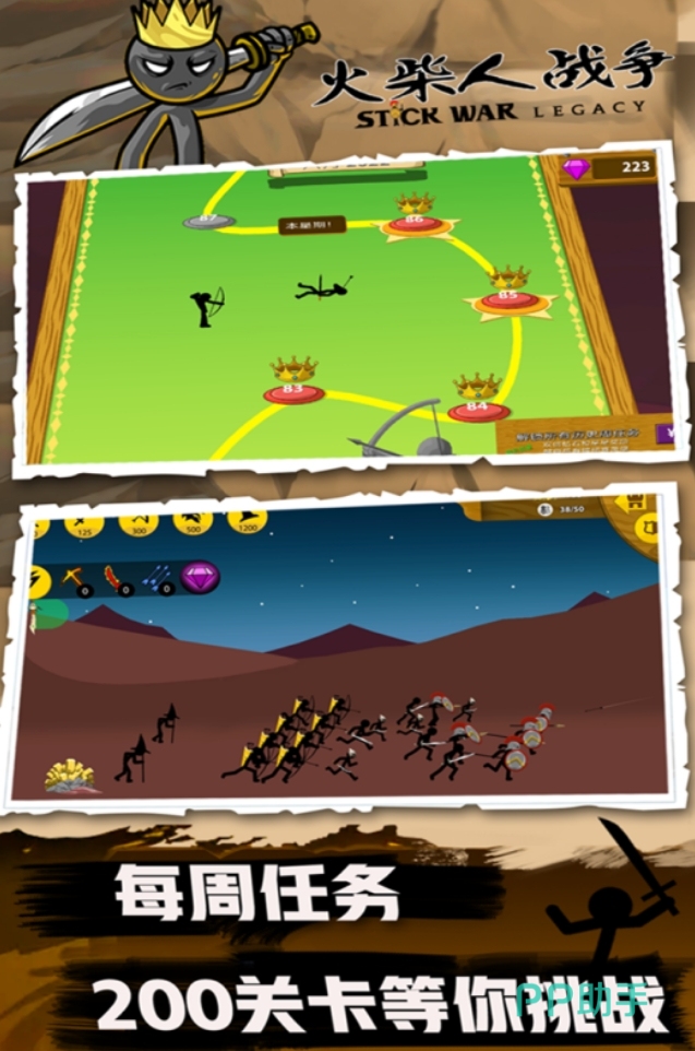 这是部类即时战斗模式的游戏,开局时人们可安排火柴人前去采集资源,并用获得的资源来兑换处各类火柴人兵种与敌人作战,能换取出来的兵种数量取决于人们获取资源的总量,速度则取决于资源采集的效率,使得人们需要在补充资源采集工人和补充兵种之间做出取舍,同时还要根据战场形式来不断更改自己的战术策略,掌控住战场上的主动。