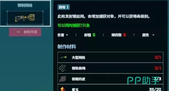 这种钢制的网枪非常强大的,如果玩家们想要获得也是非常有难度的,在使用时可以同时抓捕七只鱼,射程的速度也有五米远,零且一共拥有六发子弹,大家可以一次性使用六次来抓捕鱼类,机会还是非常多的,但是需要通过3400个金币才可以兑换,还可以通过稀有材料来进行制作,需要利用三张吞鳗的皮,这个材料是非常稀有的,玩家们在前期可以先将材料全部收集完成。