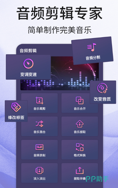 高人气音频剪辑软件,成为无数视频制作者以及音频创作专家的优质选择。我们可以轻松实现各种音频编辑及制作随心所欲制作mp3以及m4a等不同的音乐音频。拥有相当强悍的音频剪辑器,完成制作之后可以随意调节不同的格式。其中的内容极其丰富,即便新手也能轻松一步完成个性化音乐剪辑界面,可清晰听到不同的声音。