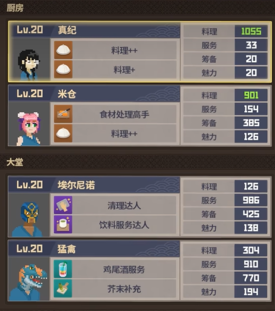 当你进入游戏的中期时,就能解锁餐厅的星级和员工了。此时经营店铺成为了游戏中的重要内容。合理安排员工,选择合适的员工来提高店铺的效率,才是成功的关键。其中,东北、詹姆斯、米仓和拉乌尔是比较推荐的员工,他们各自有有不同的技能,可以帮助你提升店铺的整体收益。