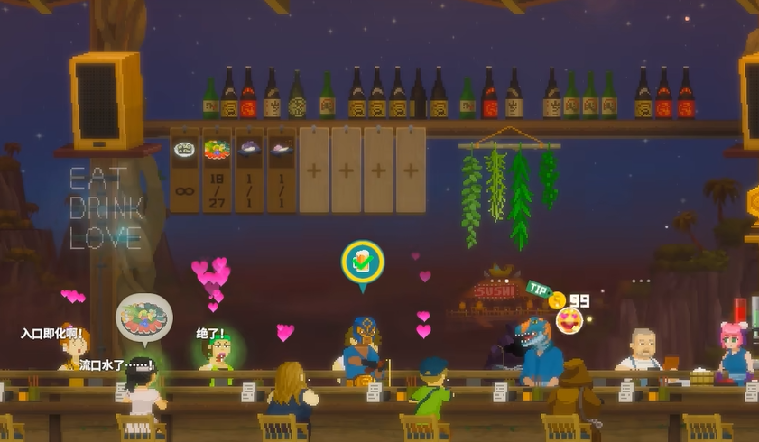 一开始,戴夫的故事从一间破旧的寿司店开始。完成序章任务的第一步是修复这间寿司店,前提是你得先潜入水中,捕获7条鱼来作为寿司食材。抓鱼的时候,记得使用鱼叉哦,不然效率太低。接下来,你需要按系统提示,制作一份寿司,并加入适量的芥末来增加其美味度。完成这些任务后,开店就能赚取一些金币,用来修理店铺。