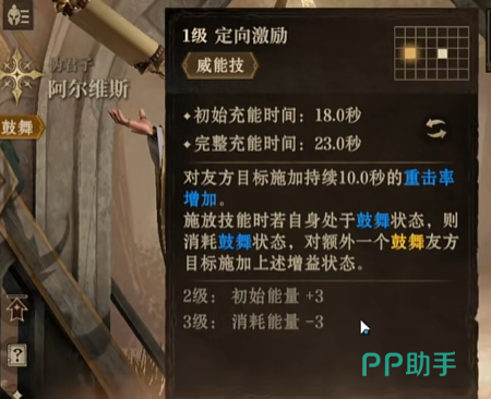 攻击光环:当友方目标成功触发重击或狂野判定时,阿尔维斯有50%的概率为其施加一层鼓舞状态,持续5秒。鼓舞状态可以增加目标20%的攻击力和10%的威能,极大地提升了队友的爆发能力。
