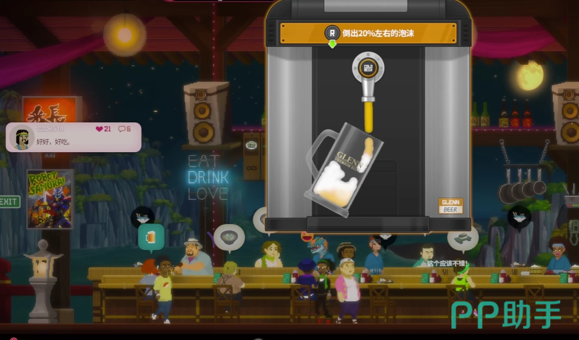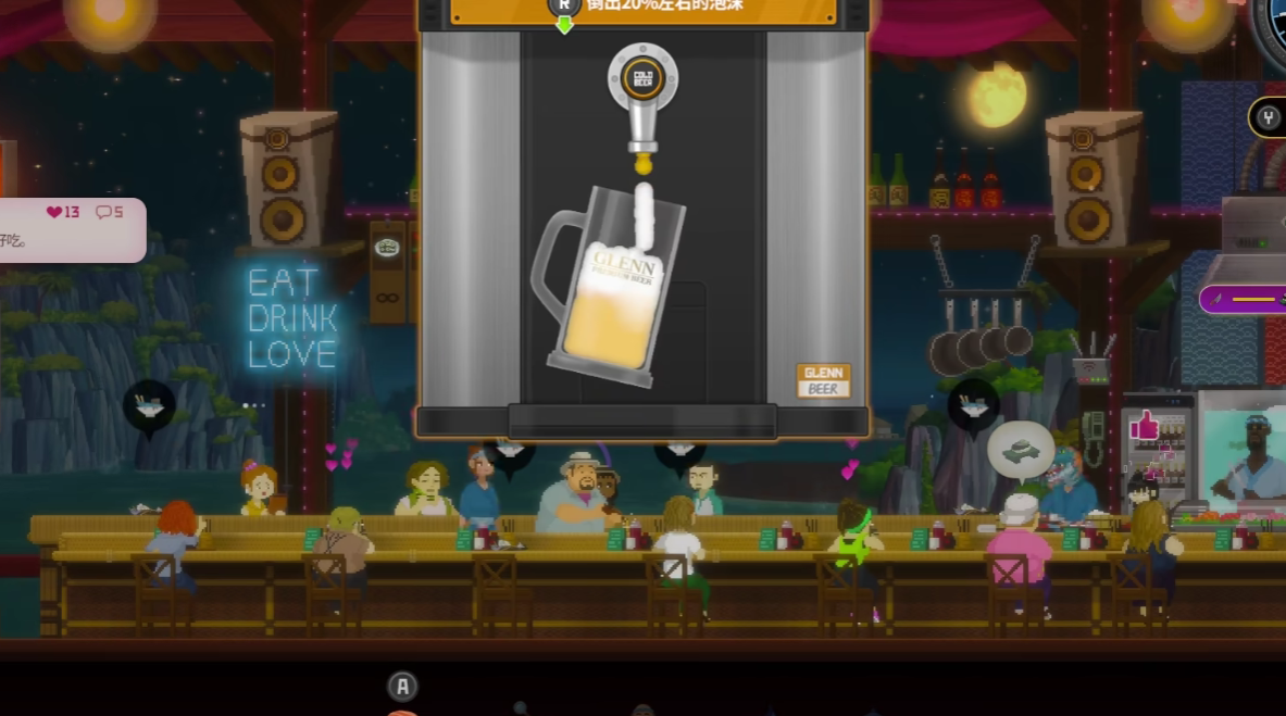 第一个值得注意的点是,在倒啤酒的期间,玩家不要一直按住倒啤酒的键位,而是按住两秒钟之后,等待一秒钟的时间,随后再按下,使用间隔的按键控制,更容易抵达80%的啤酒比例。