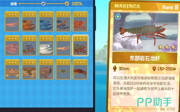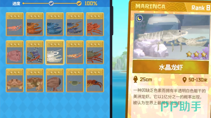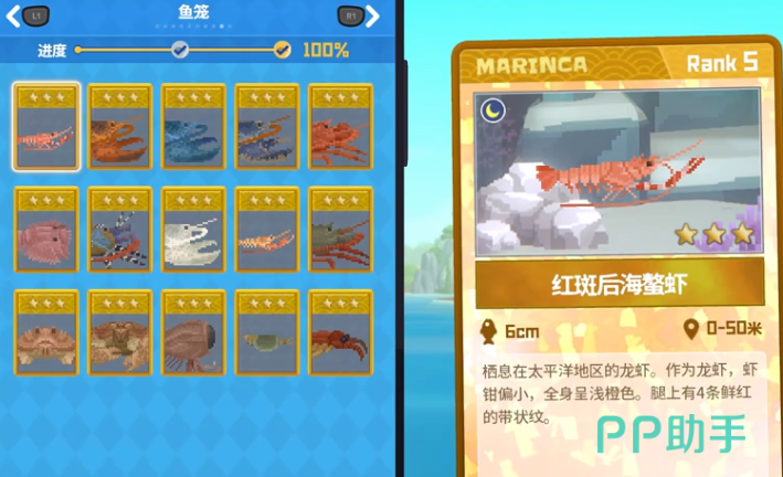 鱼笼图鉴中包括15种主要生物,其中龙虾类尤为引人注目。红斑后海螯虾是太平洋水域的常见种类,通体泛着浅橙色光泽,外壳坚硬,呈现出阳光下微微反射的质感。而美洲龙虾则被誉为“最强物种”,生活在冰冷的深海中,常出现在40米深的冰海区域内,其外壳呈现出深蓝与黑色交织的纹理,仿佛为适应深海环境而披上的伪装。极为稀有的蓝色龙虾则是图鉴中最梦幻的存在,它以200万分之一的概率出现,通体蓝色透明,犹如一块在水中游动的蓝宝石,极高的稀有度让它成为每一位潜水员都梦寐以求的收藏目标。