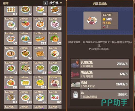 烤三色鱿鱼则是中期阶段的赚钱利器。它需要孔雀鱿鱼、吸血鱿鱼和乌贼作为主要食材,每一份满级售价同样为1480,但单次制作可以产出12份,极大地提高了效率。这道菜的受欢迎程度不仅来自其独特的三色视觉冲击,更是因为鱿鱼的鲜嫩与烤制工艺的香气交织,能够吸引高消费能力的顾客。对于餐厅已经进入15级以上的玩家,这道菜是扩大盈利的强有力选择。