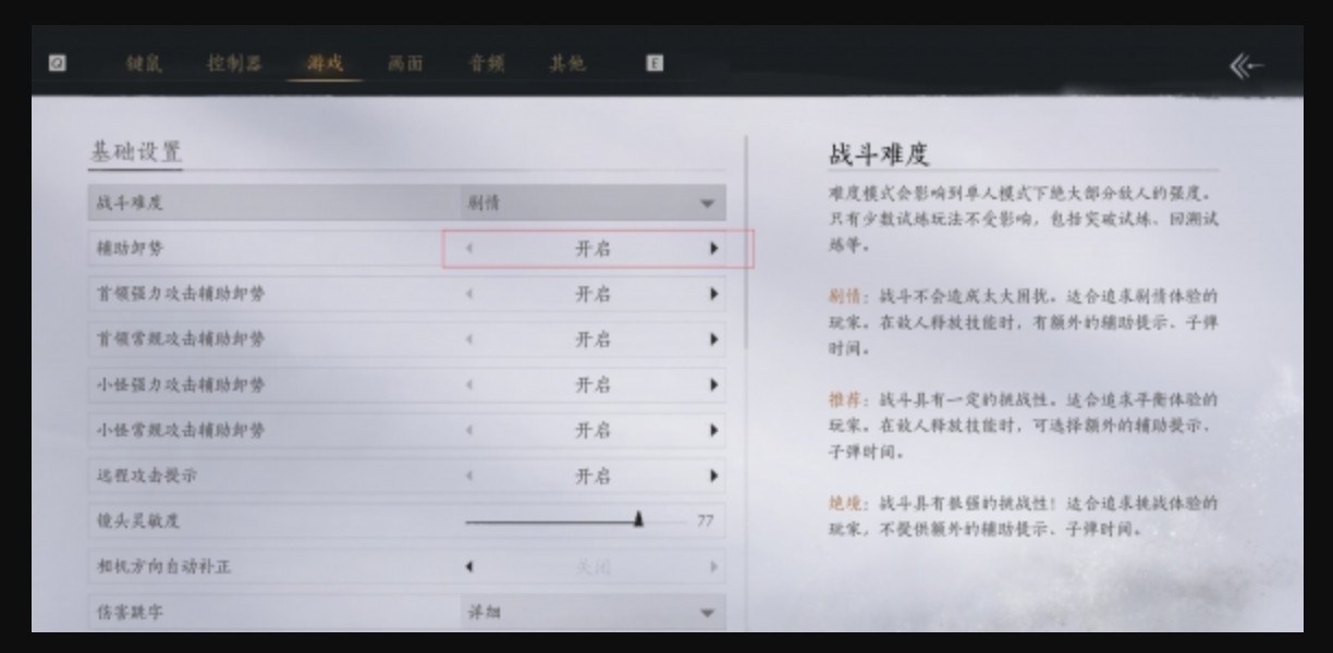 在游戏中这个辅助卸势,其实就是一个为玩家们提供的动作外挂,可以帮助大家应对许多设计不合理的战斗交互,在游戏中,大家与boss打斗时可以将难度调到最低,然后打开这个辅助卸势,可以帮助大家更好的享受剧情以及探索大世界,如果想要开启的玩家们,可以先进入游戏。