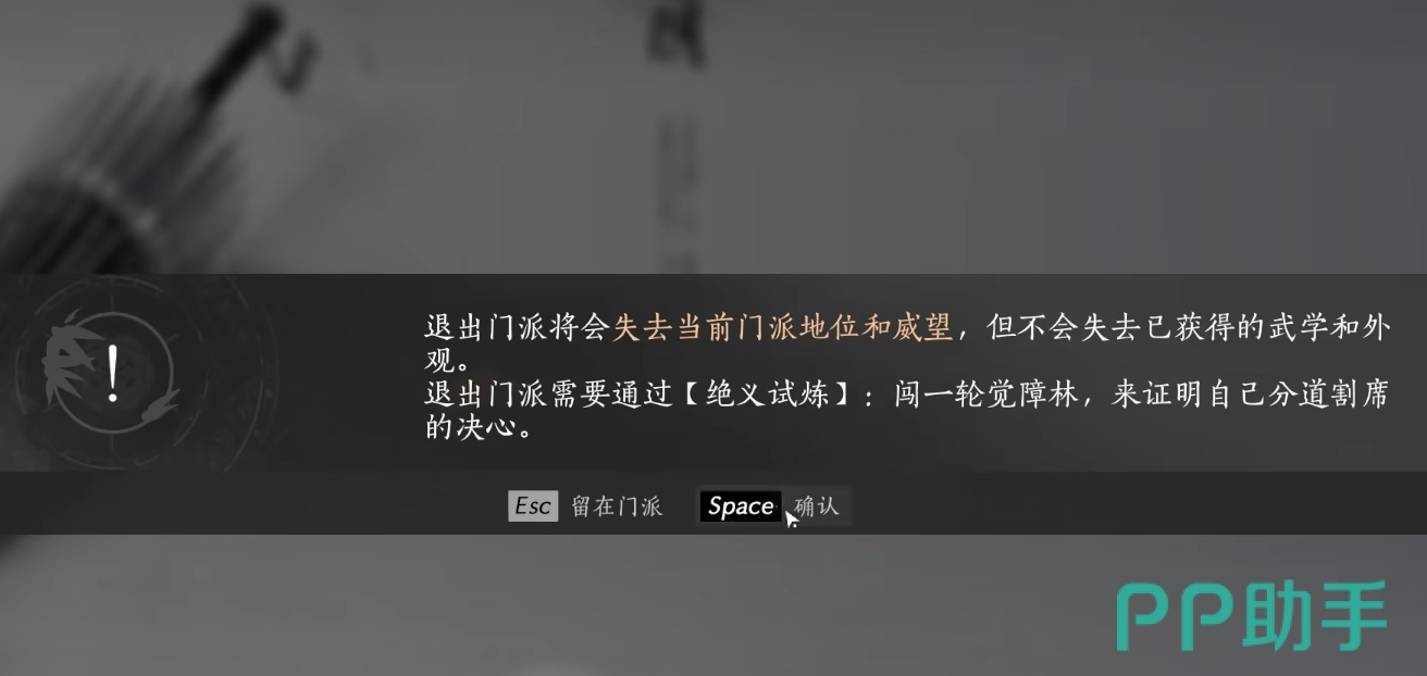 但要注意退出门派是需要人们付出点代价的,有的门派会要求玩家们去进行闯关,只要胜利了就能直接离开门派,而有的门派则需要玩家们交足一定数额的游戏货币,然后就会放玩家离开。相应的退派任务都会在点开叛逃师门的选项后提示玩家,若自己已经下定决心要离开门派,可直接点确定就能接下该任务,但要注意若自己之前退出过该们,再退出时需要等待一段时间。