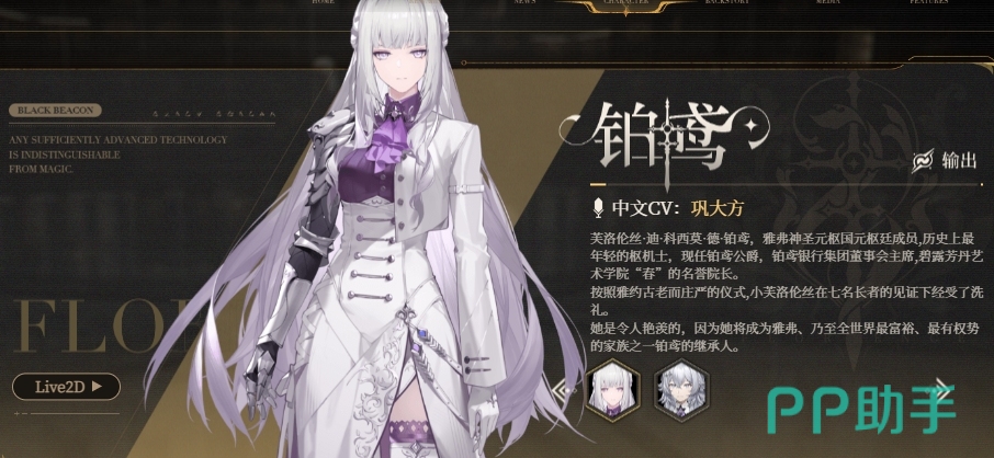 柏鸢是元枢廷成员,目前担任铂鸢公爵,并且是铂鸢银行集团董事会的主席,同时担任碧露芳丹艺术学院“春”系的名誉院长。她的背景故事不仅丰富了角色的人设,也为其技能设计提供了独特的情境。柏鸢的身世和经历使她在游戏世界中具备了非凡的气场,在战斗中的表现也与其贵族身份相得益彰。