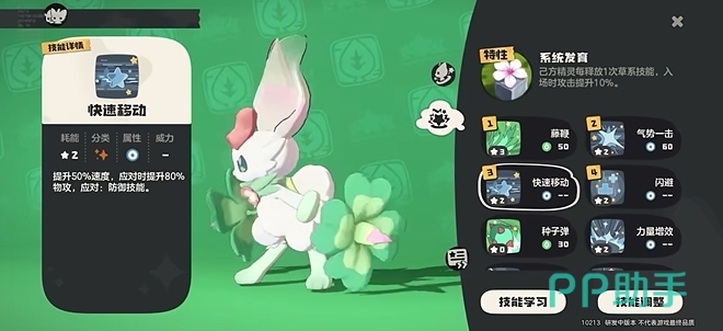 春花兔的快速移动技能可以提升50%的速度,应对时提升80%的物理攻击,特别适合在需要迅速突破敌方防守的情况下使用。赋予了春花兔极高的机动性和爆发力,使它能够在关键时刻打出高额伤害,打破战局。建议在PVP对战中使用这个技能,尤其是在面对速度较低的对手时,春花兔可以先手制敌。
