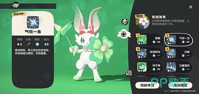 春花兔的特性之一是系统发动,每当己方精灵释放草系技能时,春花兔的攻击力会逐渐提升,每次攻击提升10%。使得春花兔在队伍中能够持续发挥强大的输出能力,不仅增加了草系队伍的整体伤害,也使得春花兔在长时间战斗中的表现更加优秀。