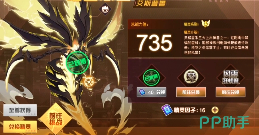 闪雷狂蜂翼技能也是必中的,这个技能可以消除对手的回合类效果,如果消除成功,对手下2回合受到的伤害会翻倍,此外还有一半的几率会直接触发害怕的状态,当然这个效果正好碰上对面的强化的话,大家还会看到有30%数值的提升效果,正好将目标给击败的话则下1回合会反弹受到伤害的1/2,艾斯普鲁作为高级活动精灵具有一些克制关系,它可以克制冰暗影、暗影、水战斗、飞行暗影和虫这些属性的精灵。