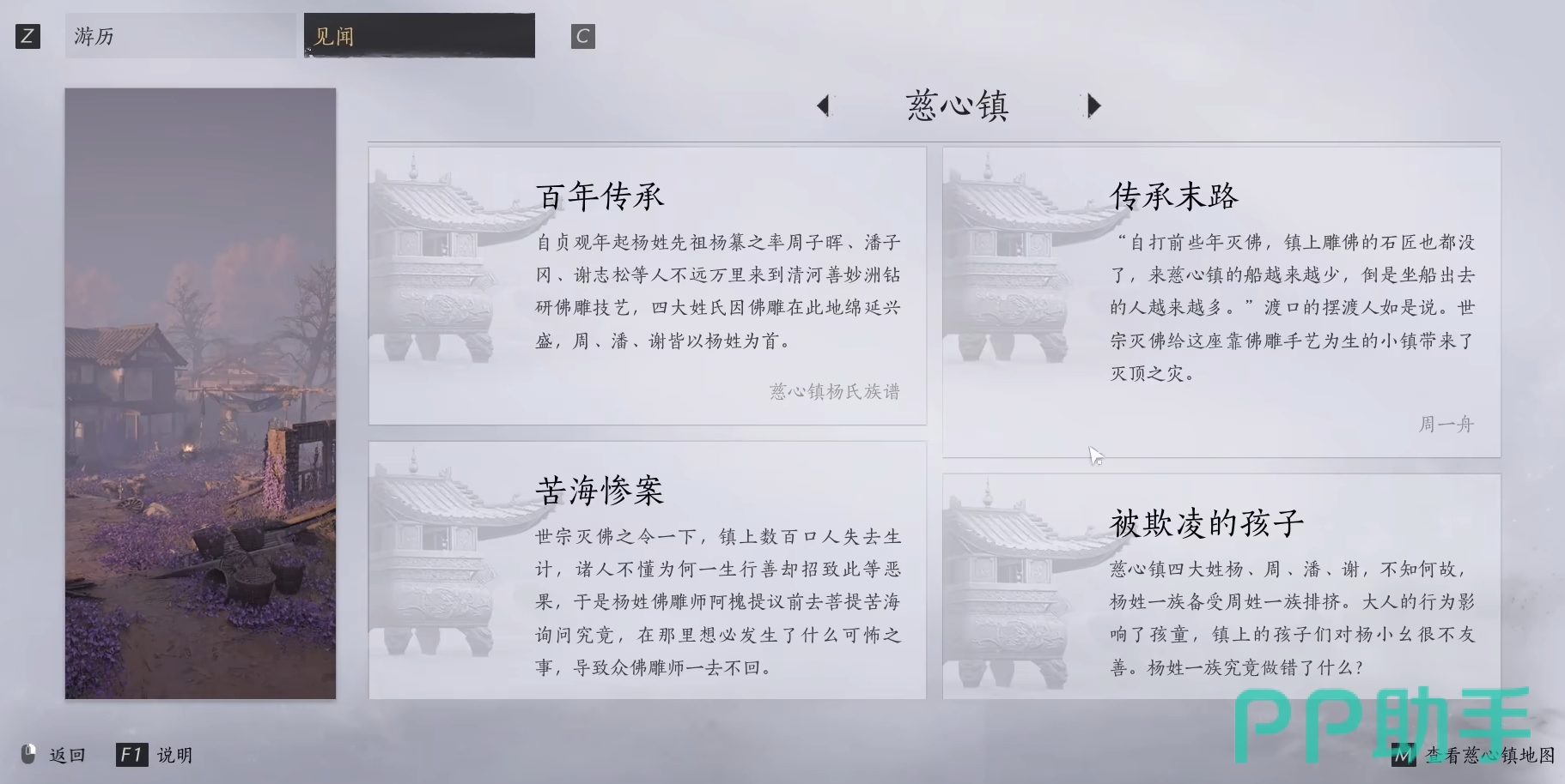 至此,燕云十六声慈心镇见闻怎么做就全分享完了。慈心镇的见闻任务只要找到关键NPC就能轻松完成,并不是非常复杂,各位可找时间去讲它们都做了,让自己的探索度能涨得更快一些。