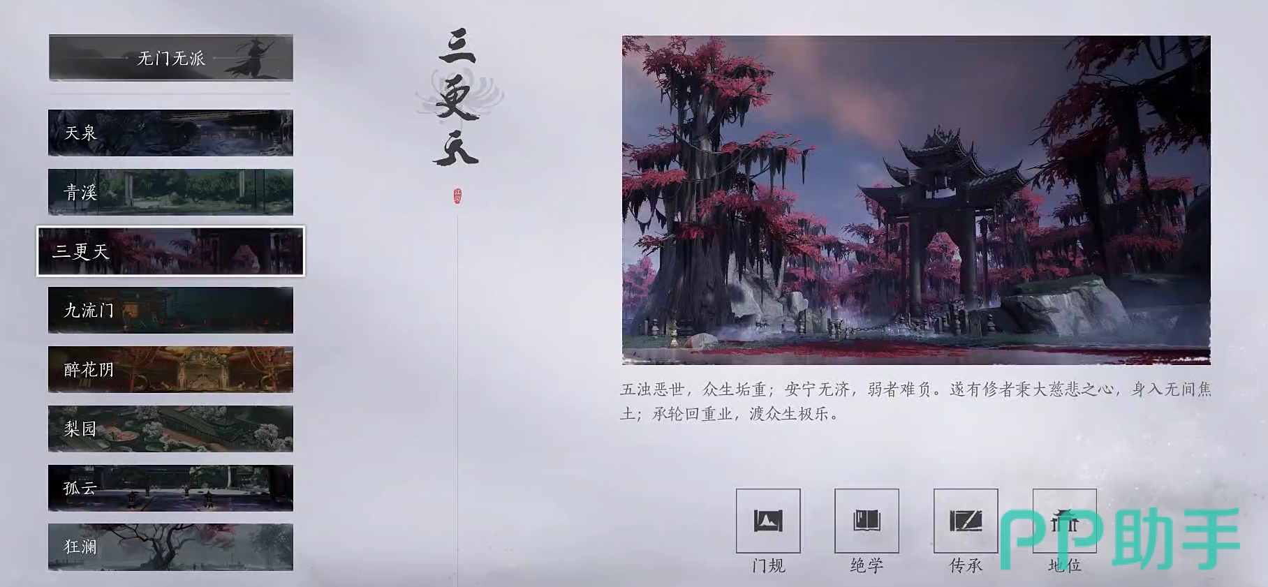 想体验成为正派大侠的话,不妨加入天泉,该门派的门规会让玩家前往行乞处帮助他人,能满足玩家成为行侠仗义的需求,缺点是该门派的门规非常严苛。